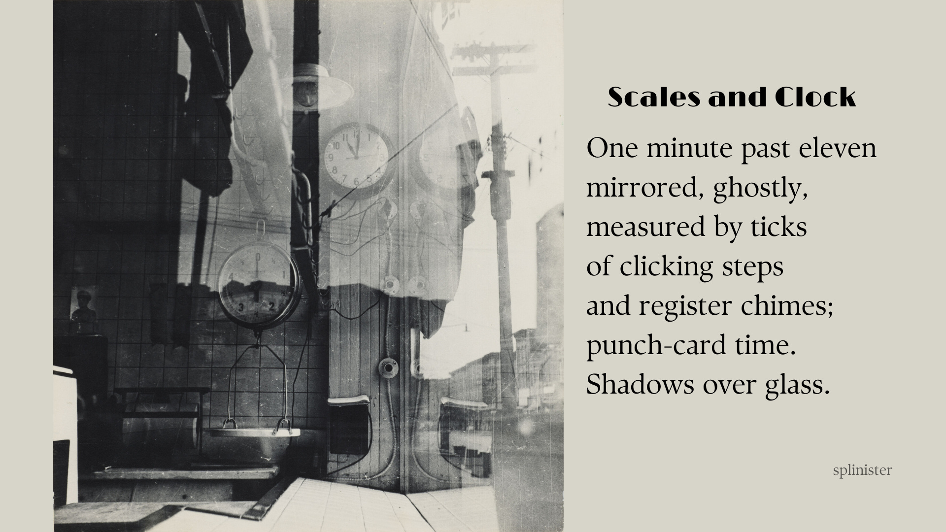 The above image was a gift from the search engine, called ‘Scales and Clocks’, photographed by anonymous in 1949, and in the Harvard Art Museum collection. I wrote the accompanying piece in response to the image.