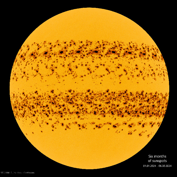 Using images obtained by the Solar Dynamics Observatory (SDO), I have created a composition of 182 images (one for each day of these six months) in which you can see all the sunspots that have transited the disk of our star from January 1 to January June 30th.