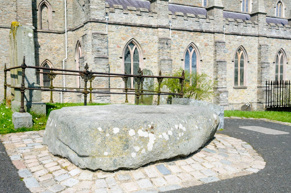 It is claimed that Patrick is buried outside Downpatrick Cathedral. A large granite stone marks the spot, placed there in the early 20th century to prevent pilgrims from taking fistfuls of grave-soil away with them. However, the tradition of Patrick’s burial at this location is influenced by late 12th century propaganda (some 700 years after Patrick’s demise) by the Anglo-Norman John de Courcy. Understanding the deep-rooted appeal of the cult of relics and the important role of saints as patrons to the local people, de Courcy staged the "discovery" of the relics of saints Brigit, Colum Cille and Patrick in 1185. He exhumed their bodies and translated the relics into a new tomb at Downpatrick. 4