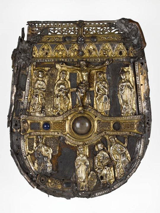 The second one is the Shrine of Saint Lachtin’s Arm (c. 1118–1121 CE, National Museum of Ireland). A bronze-gilt reliquary depicting a clenched fist, which may have been carried into battle as a protective talisman (it’s fun to speculate!).