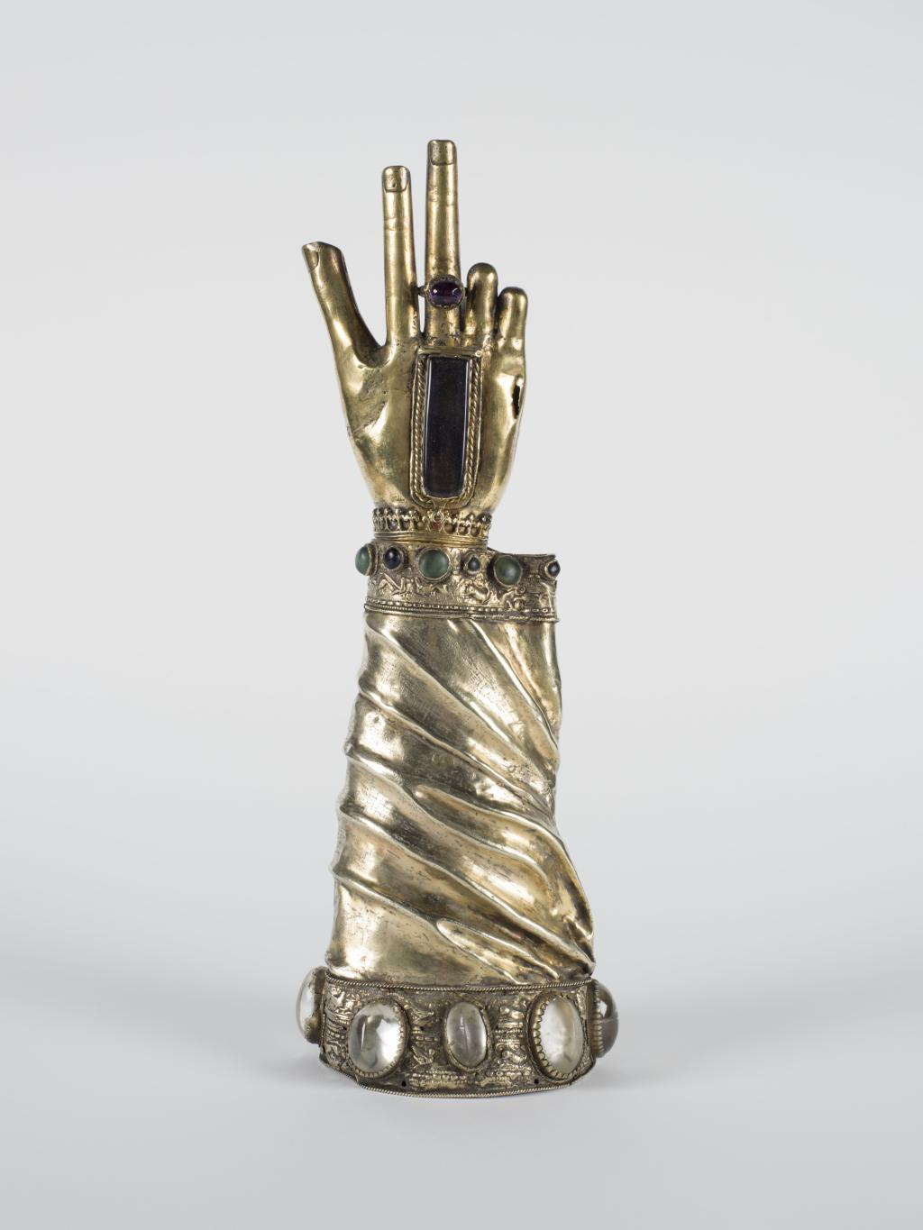 Made of gilt silver, the shrine depicts a sleeved right forearm and hand in the position of a blessing. It is decorated with die-stamped animals and a series of green, blue and black domed glass studs.